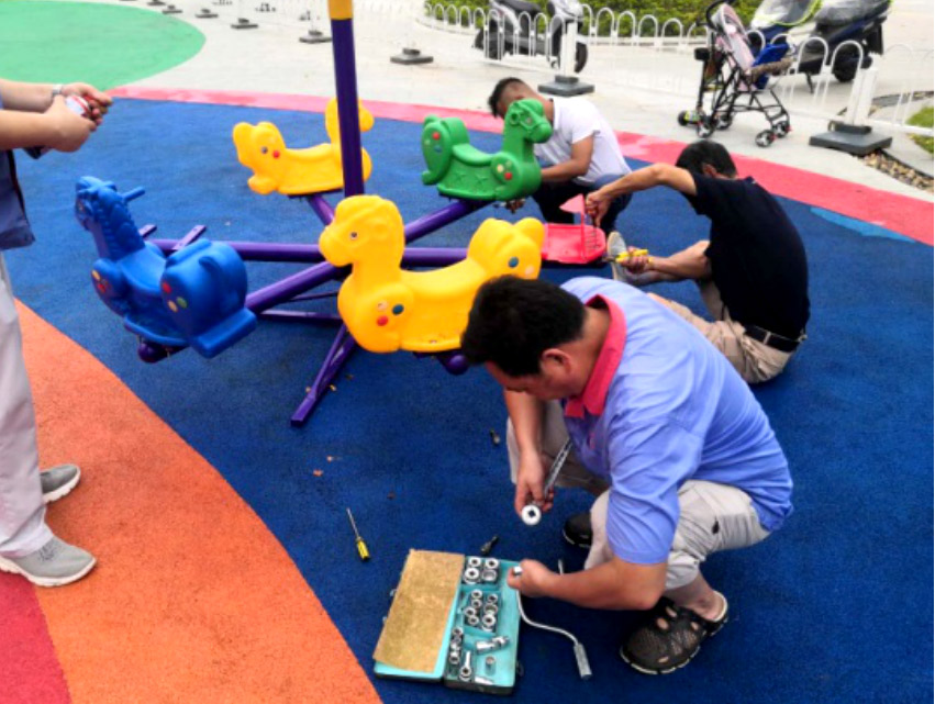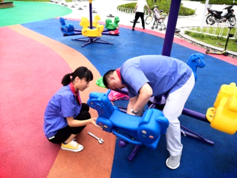 皖維櫻花公園的兒童游樂設(shè)施安裝以后,受到了附近職工住戶的青睞,茶余飯后紛紛帶孩子過來玩耍。由于設(shè)施使用頻率高同時長期經(jīng)受風(fēng)吹日曬,部分設(shè)施出現(xiàn)了零件老化松動的狀況。為消除安全隱患,打造個小朋友安心玩耍的場所,8月21日,社區(qū)黨總支機(jī)關(guān)黨支部房地產(chǎn)公司黨小組開展了次特殊的黨日活動,對櫻花公園兒童樂園內(nèi)的游樂設(shè)施進(jìn)行完全隱患排查和治理。