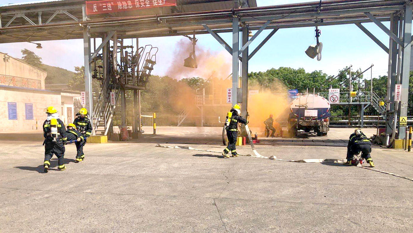 專項(xiàng)演練由保衛(wèi)處牽頭聯(lián)合有機(jī)分廠、生產(chǎn)安環(huán)部等單位開展。演練模擬有機(jī)分廠液化工段卸料站裝卸區(qū)槽罐車因駕駛不當(dāng),撞擊到另輛正在進(jìn)行卸料作業(yè)的槽罐車上,造成現(xiàn)場車輛車尾管道破裂,大量的物料從破裂口處流淌在地面上,流淌的液體遇火花,造成流淌火并引燃槽罐車,火勢迅速向四周擴(kuò)散,當(dāng)班人員無法撲滅,情況緊急。