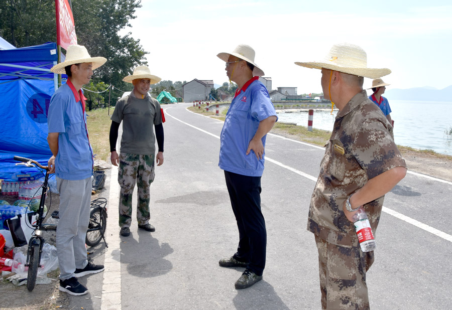 8月3日,驕陽似火,巢湖地區(qū)高溫度達36℃。在如此炎熱的天氣里,皖維防汛突擊隊員們的身體狀況讓公司導時刻記掛在心。這樣的高溫下,突擊隊員狀態(tài)怎么樣?隊員們有哪些實際需要?上班,張正和、吳霖、閆昌斌等導就驅(qū)車前往巢湖大堤,慰問防汛線的突擊隊員們。