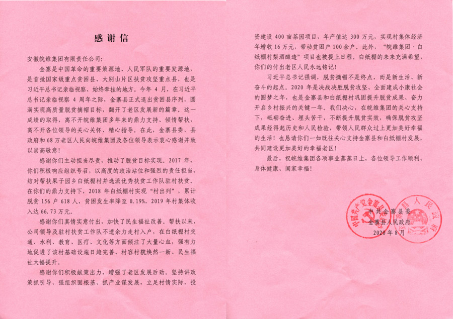 金寨是中國(guó)革命的重要策源地、人民軍隊(duì)的重要發(fā)源地,是批級(jí)重點(diǎn)貧困縣、大別山片區(qū)扶貧攻堅(jiān)重點(diǎn)縣,也是習(xí)近平總書(shū)記親臨視察、始終牽掛的地方。今年4月,在習(xí)近平總書(shū)記親臨視察4周年之際,金寨縣正式退出貧困縣序列,圓滿實(shí)現(xiàn)高質(zhì)量脫貧摘帽目標(biāo),翻開(kāi)了老區(qū)發(fā)展新的篇章。這成績(jī)的取得,離不開(kāi)皖維集團(tuán)多年來(lái)的鼎力支持、傾情幫扶,離不開(kāi)各位導(dǎo)的關(guān)心關(guān)懷、精心指導(dǎo)。在此,金寨縣委、縣中國(guó)和68萬(wàn)老區(qū)人民向皖維集團(tuán)及各位導(dǎo)表示衷心感謝并致以崇高敬意! 感謝你們主動(dòng)擔(dān)當(dāng)盡責(zé),推動(dòng)了脫貧目標(biāo)實(shí)現(xiàn)。2017年,你們積響應(yīng)組織號(hào)召,以髙度的政治站位和強(qiáng)烈的責(zé)任擔(dān)當(dāng),結(jié)對(duì)幫扶果子園鄉(xiāng)白紙棚村并選派秀扶貧工作隊(duì)駐村扶貧。在你們的鼎力支持下,2018年白紙棚村實(shí)現(xiàn)“村出列”,累計(jì)脫貧156戶(hù)618人,貧困發(fā)生率降至0.19%,2019年村集體收入達(dá)66.73萬(wàn)元。感謝你們真情實(shí)意付出,加快了民生福祉改善。幫扶以來(lái),公司導(dǎo)及駐村扶貧工作隊(duì)不遺余力走村入戶(hù),在白紙棚村交通、水利、教育、醫(yī)療、文化等方面傾注了大量心血,強(qiáng)有力地有利于了該村基礎(chǔ)設(shè)施日趨完善、村容村貌煥然新、民生福祉大幅提升。 感謝你們積獻(xiàn)策出力,增強(qiáng)了老區(qū)發(fā)展后勁。堅(jiān)持講政策抓引導(dǎo)、強(qiáng)組織固根基、抓產(chǎn)業(yè)謀發(fā)展,立足村情實(shí)際,投資建設(shè)400畝茶園項(xiàng)目,年產(chǎn)值達(dá)300萬(wàn)元,實(shí)現(xiàn)村集體經(jīng)濟(jì)年增收16萬(wàn)元,帶動(dòng)貧困戶(hù)100余戶(hù)。此外,“皖維集團(tuán)?白紙棚村梨酒釀造”項(xiàng)目也被提上日程。白紙棚的未來(lái)充滿希望,你們的付出老區(qū)人民長(zhǎng)久銘記! 習(xí)近平總書(shū)記強(qiáng)調(diào),脫貧摘帽不是終點(diǎn),而是新生活新奮斗的起點(diǎn)。2020年是決戰(zhàn)決勝脫貧攻堅(jiān)、完全建成小康社會(huì)的圓夢(mèng)之年,也是金寨縣和白紙棚村鞏固提升脫貧成果、奮力開(kāi)啟鄉(xiāng)村振興的關(guān)鍵年。我們決心,在皖維集團(tuán)的關(guān)心支持下,砥礪奮進(jìn)、埋頭苦干,不斷提升脫貧實(shí)效,確保脫貧攻堅(jiān)成果經(jīng)得起歷史和人民檢驗(yàn),帶人民群眾過(guò)上更加美好幸福的生活!也懇請(qǐng)你們?nèi)缂韧P(guān)心支持金寨縣和白紙棚村發(fā)展,共同建設(shè)更加美好的幸福老區(qū)! 后,祝皖維集團(tuán)各項(xiàng)事業(yè)蒸蒸日上,各位導(dǎo)工作順利、身體健康、闔家幸福!