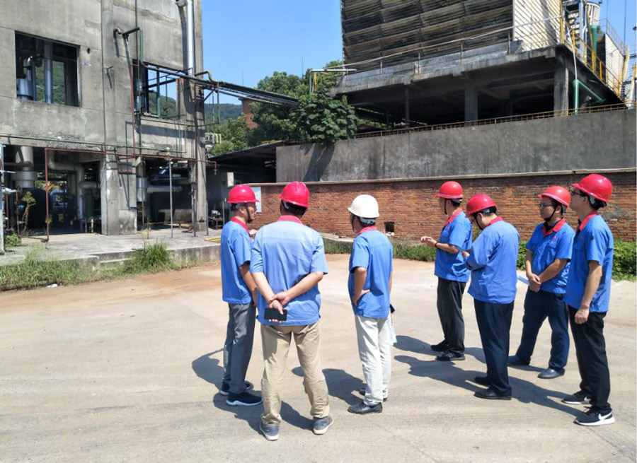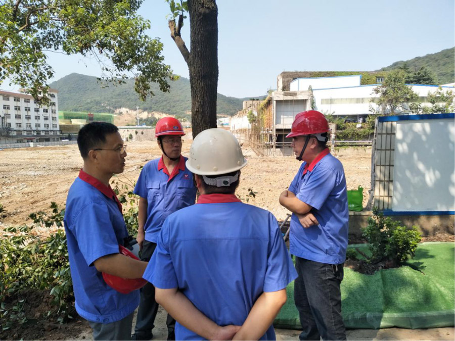 高申保在PVB膠片項(xiàng)目施工現(xiàn)場(chǎng)檢查蒸汽管線水泥支柱拆除、基礎(chǔ)混凝土澆筑等工作開展情況,與項(xiàng)目經(jīng)理沈小罡、施工單位負(fù)責(zé)人交流。